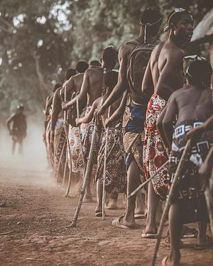A group of young people, guided by an enigmatic figure, advance into the twilight. A young man, lost in his memories, expresses the tension between the lure of the new and the weight of ancestral heritage.