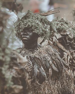 Dressed in natural fibers, a young girl takes part in the Ngodo purification procession, perpetuating ancestral traditions. Her outfit symbolizes the link to nature and the ongoing creation of meaning in Sawa culture.